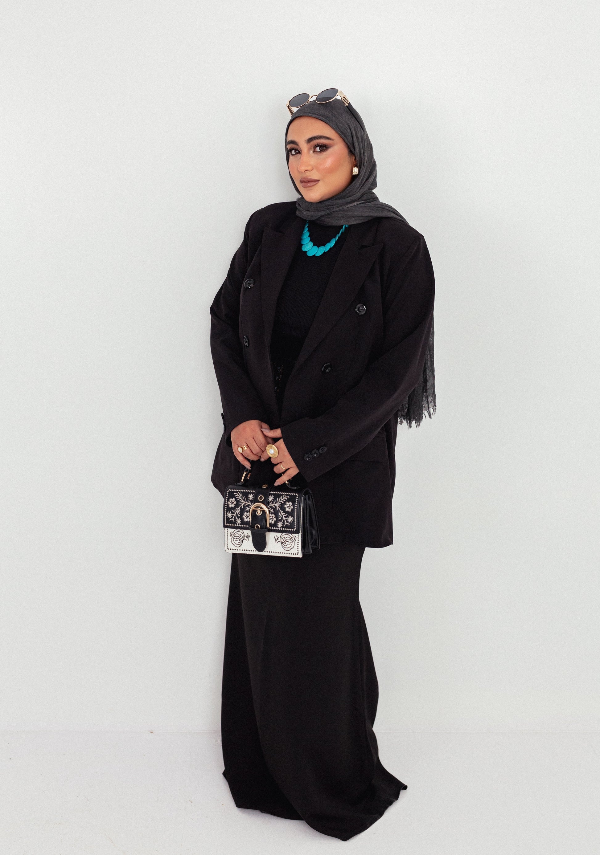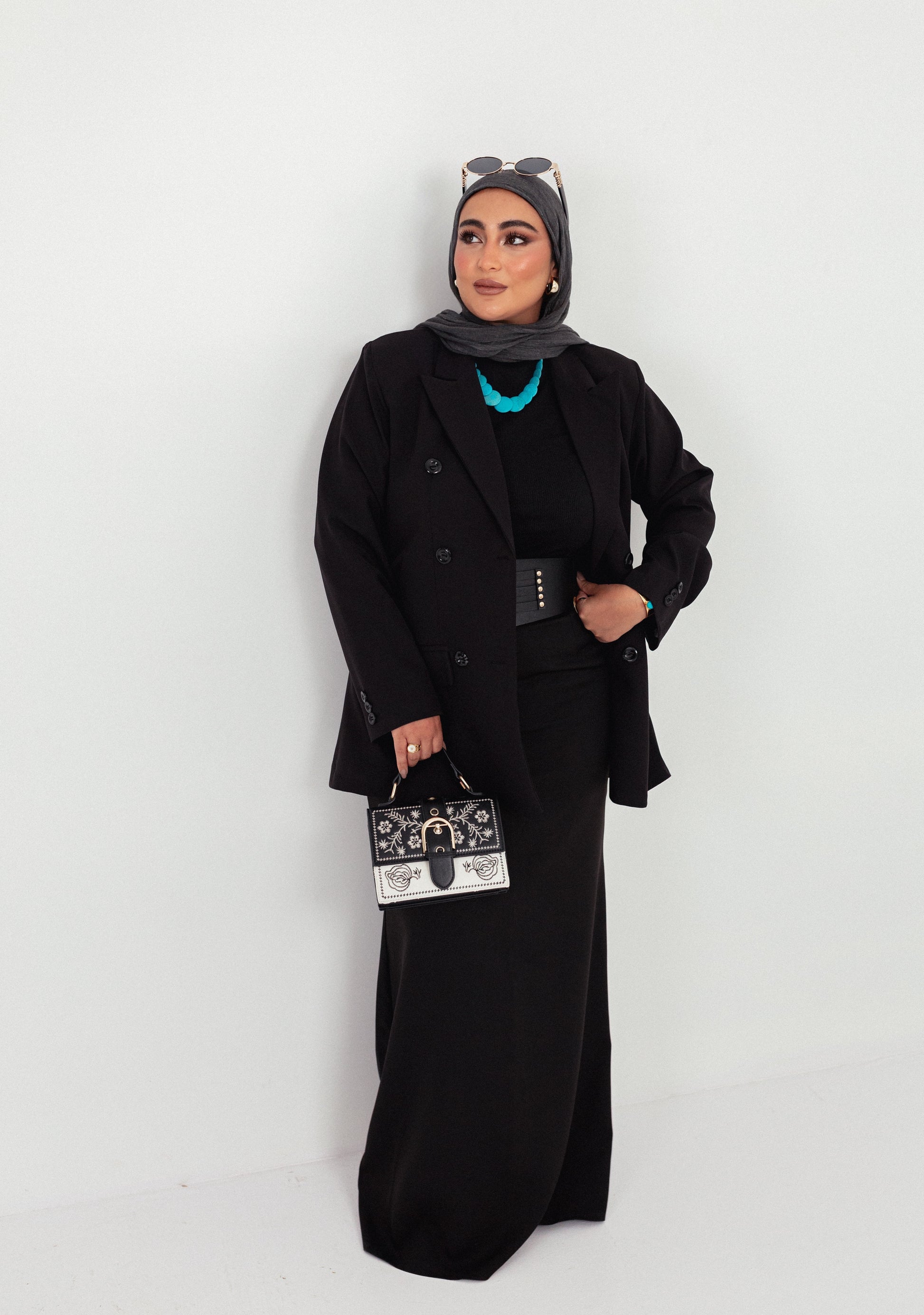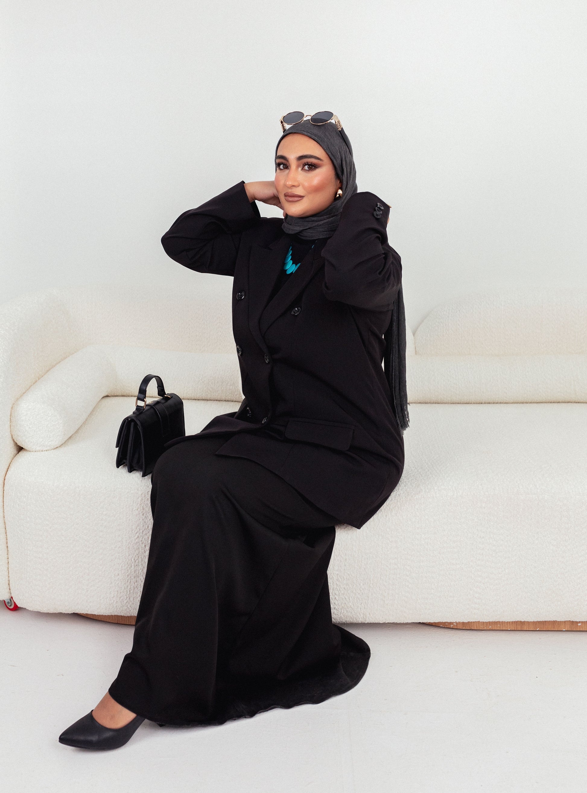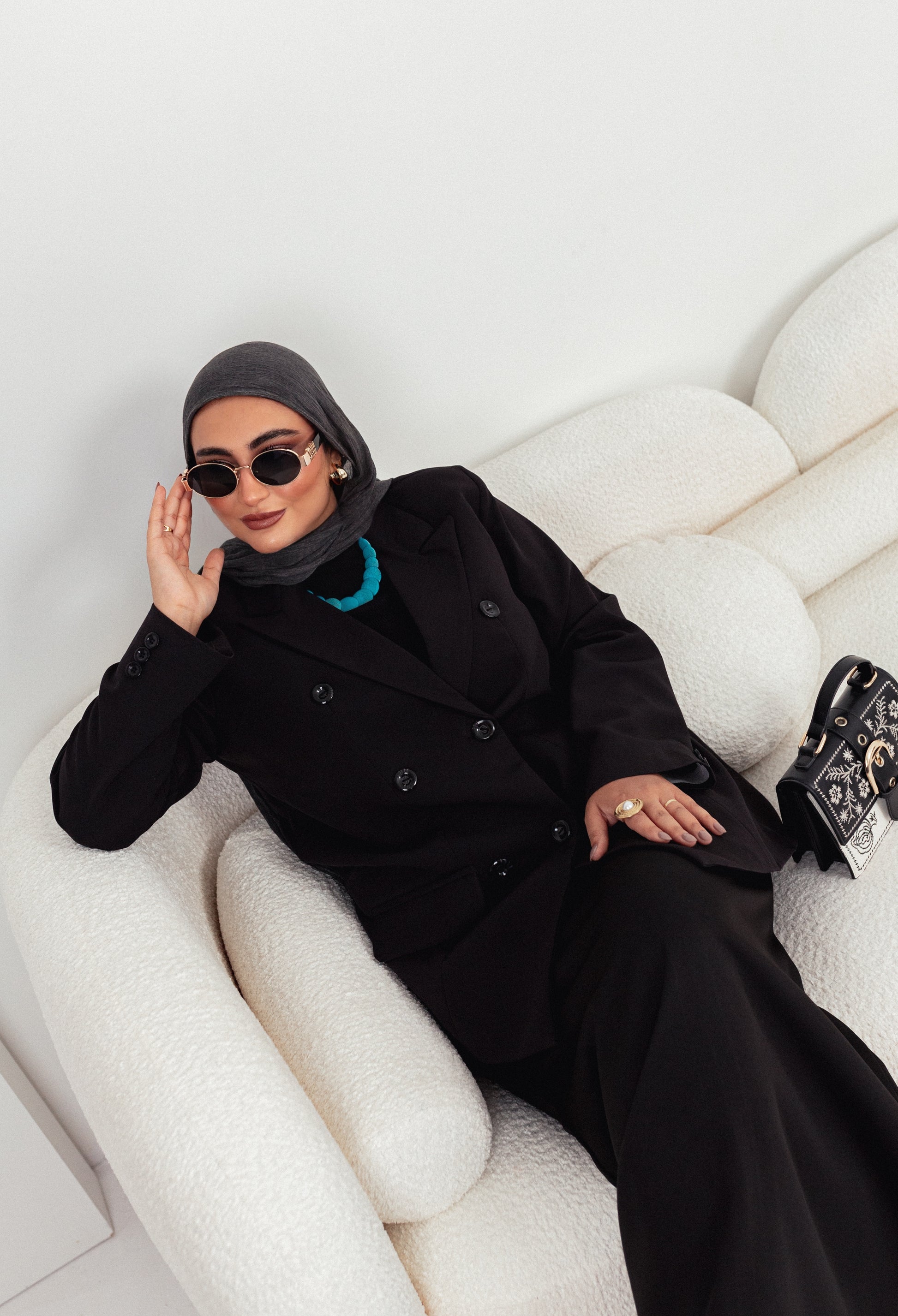 “البدلة السوداء الكلاسيكية المطلقة، مصممة بدقة لتمنحك أناقة في كل خطوة.”
