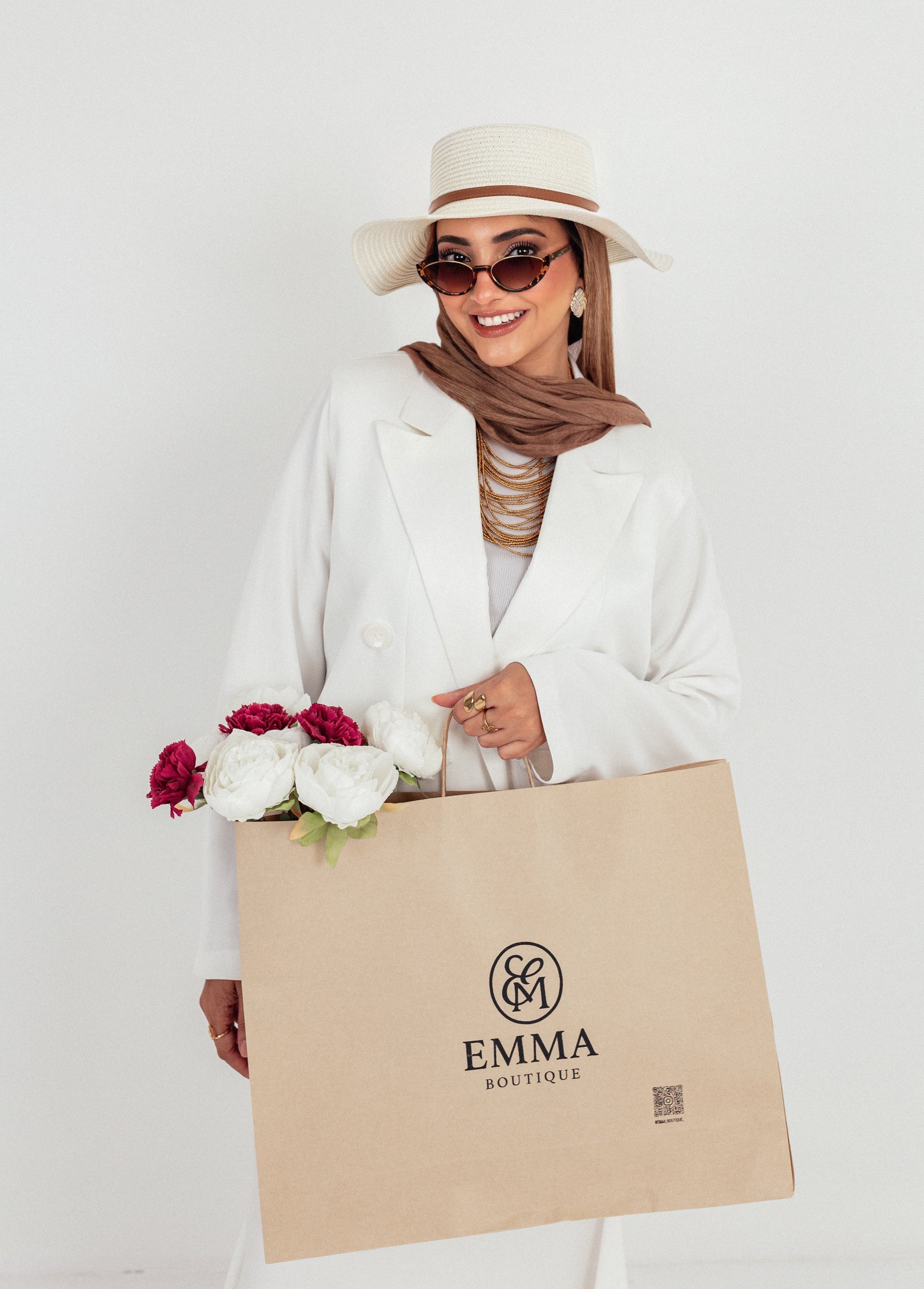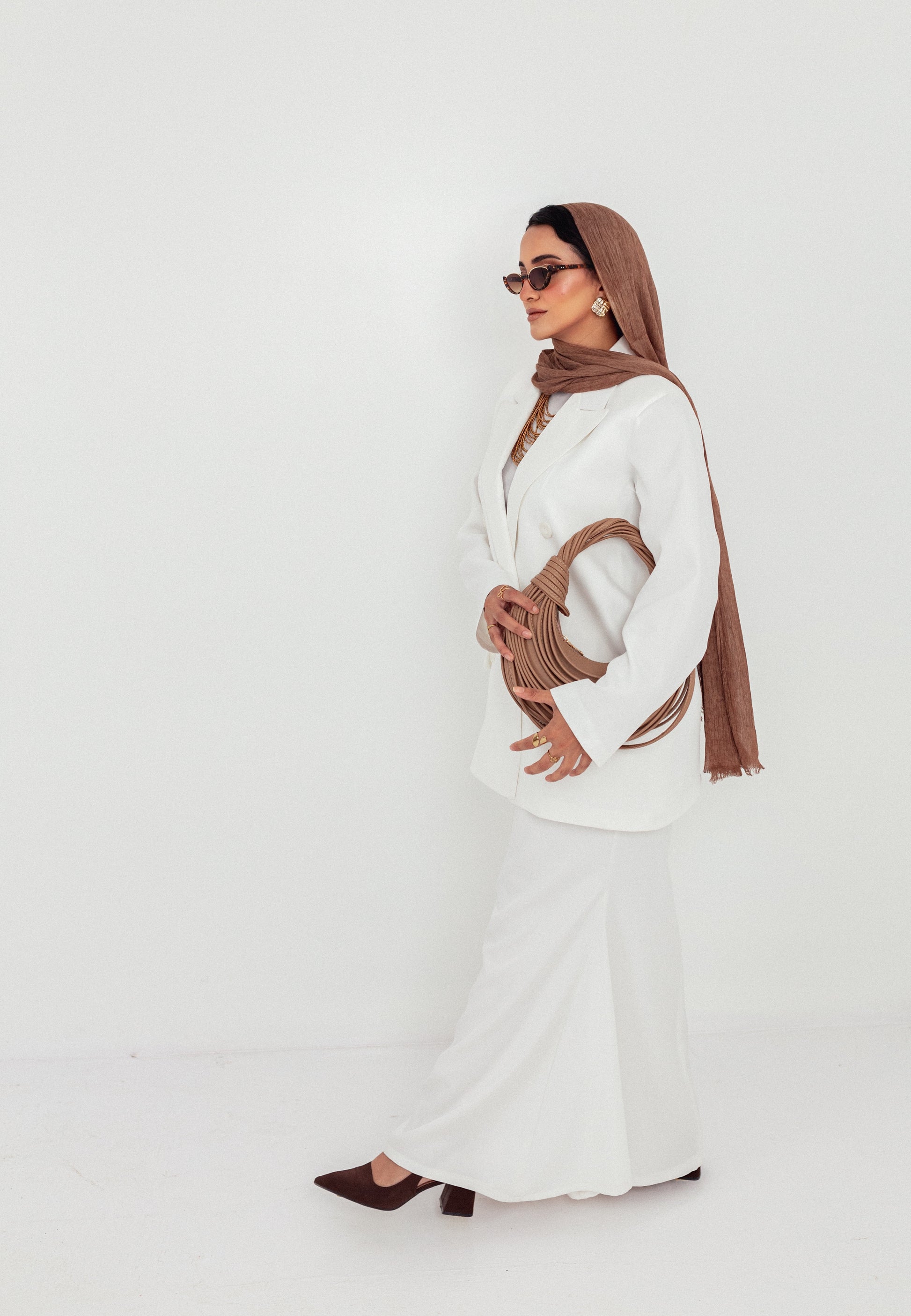 “بدلة باللون الأبيض النقي، تعكس الرقي الكلاسيكي الخالد. مثالية للمناسبات الرسمية أو الإطلالات اليومية الجريئة.”